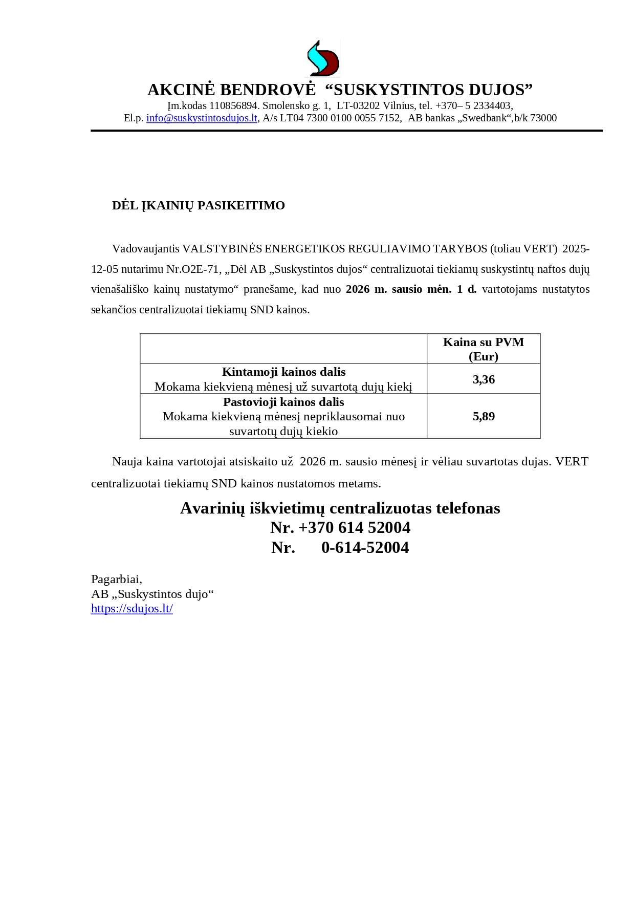 Vadovaujantis VALSTYBINĖS ENERGETIKOS REGULIAVIMO TARYBOS (toliau VERT) 2024-11-28 nutarimu Nr. O3E-1548, „Dėl AB „Suskystintos dujos“ centralizuotai tiekiamų suskystintų naftos dujų vienašališko kainų nustatymo“ pranešame, kad nuo 2026 m. sausio mėn. 1 d. vartotojams nustatytos sekančios centralizuotai tiekiamų SND kainos.